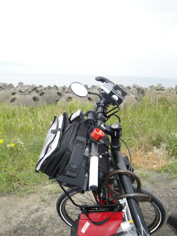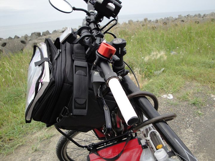 그런데 이게 웬 일. 중간에 왼쪽 핸들이 빠졌다. 여행 중에는 예기치 않은 크고 작은 사고가 잇달은다. 펑크는 물론이죠, 브레이크 고장, 스탠드 파손 등등. 어느 정도의 수리는 직접 할 수 있어야 편하다. 최소한의 재료로 가지고 있어야 한다. 여행 중에 펑크를 몇 번이나 고쳤는지 모른다 ^^
